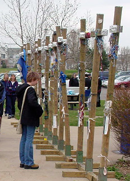 A visitor peers at the famed wooden crosses that once stood atop Rebel Hill three years ago. The crosses, built by Greg Zanis have toured the country to various memorials and prayer services since the Columbine tragedy in 1999.