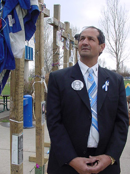 Cross builder Greg Zanis stands next to his famed crosses that have become a symbol of hope and an icon of the Columbine tragedy.