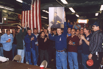 Fireman at a fire station in Harlem known as the "Harlem Zoo" hold up a framed photo of one of their lost comrades in the September 11th tragedy.
