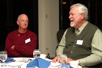 Bob Curnow, father of the late Steve Curnow who lost his life in the Columbine tragedy, and who is also a board member of The Columbine Memorial project, listens to Robert Easton, Executive Director of the Foothills Park and Recreation District, speaks on the status of the endeavor slated for completion in 2005. |