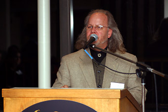 Artist and author Phil Lawson briefly addresses guests after receiving an award for his role in the development of the CD's cover art that resulted in being honored with the use of the mixed-media work done for Columbine by reknowned illustrator Drew Struzan.