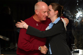 Cofounder Nina Tamburello hugs Bob Curnow after handing him a