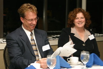 LFC artist and music pastor for Church in the City, Brad Richardson, enjoys reading the event's program with his wife, Laura. As project chaplain for LFC for nearly 5 years, Brad opened the awards banquet with a prayer. |